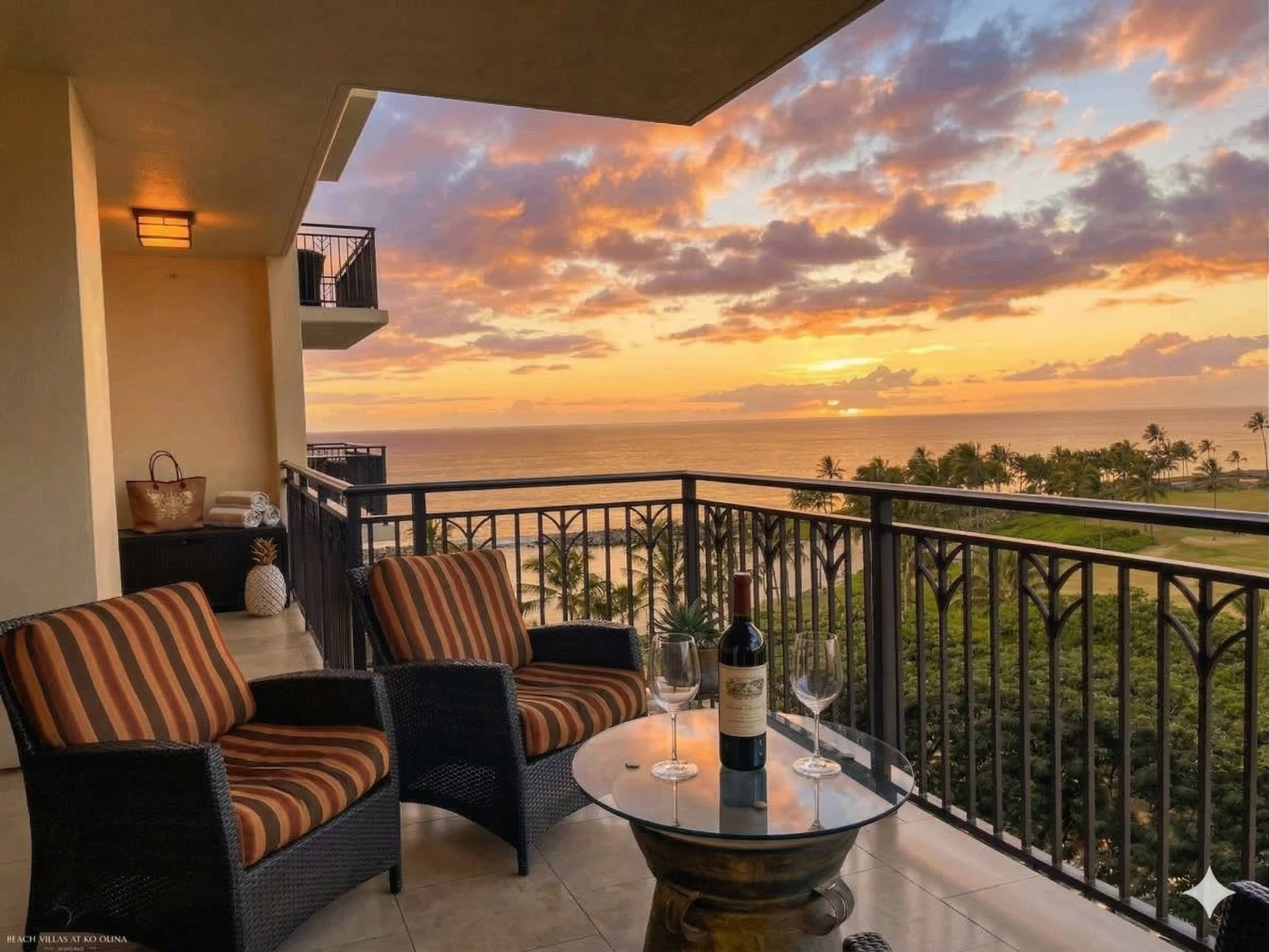 This luxury suite is an end unit on 8th floor of the Beach Tower (tower next to the ocean) with a spectacular panoramic view of the ocean and lagoons. The Beach Villas is on the beach between the ocean in the front and LPGA Championship Ko Olina Golf Course in the back.